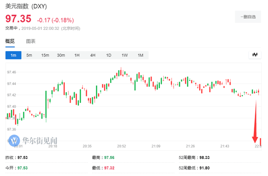 美元指数短线走低,跳水10点至日低97.31,日内当前跌幅0.22%,10年期美债收益率下跌至2.477%,美国4月ISM制造业数据公布之前交投在2.500%附近。