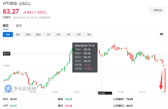 WTI原油期货在EIA政府版原油库存周报发布后走低0.37美元,短线最低触及63.22美元/桶,使得日内当前跌幅扩大至1%,逼近亚太尾盘录得的日低63.09美元/桶。