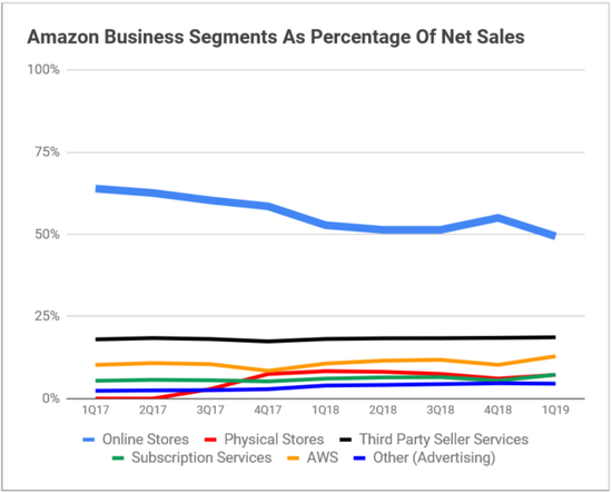 由该公司新的Whole Foods商店组合领导的Physical Stores,从不到两年前的亚马逊业务的0%上升到第一季度的7%。实体店收入同比增长1%至43亿美元。这些数据有一点需要注意:来自在线杂货订单的收入进入在线商店桶,因此实体店的实际贡献略高于数字所示。