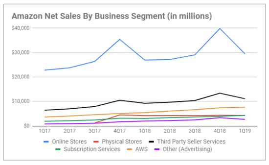 其他:还有一些其它业务,主要由广告业务组成,该业务正在迅速成为Google和Facebook的威胁。其他业务占亚马逊整体业务的5%,第一季度的收入为27亿美元,同比增长34%。