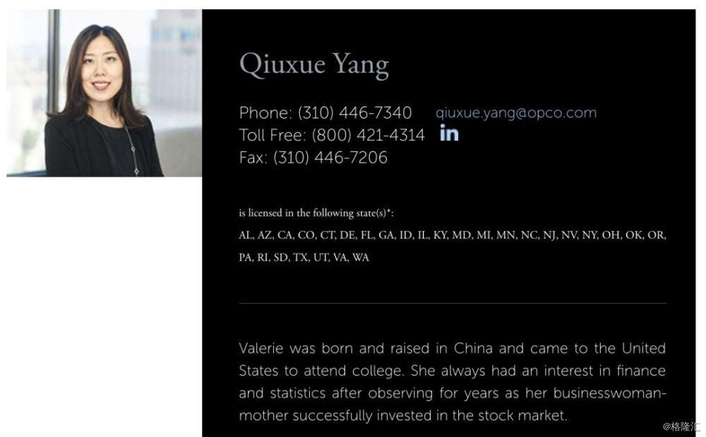 据报道,这名在Sherry Guo一家和辛格之间牵线搭桥的财务顾问名为Qiuxue Yang(英文名为Valerie),就职于Summa Group(隶属于奥本海默金融服务公司)。Summa Group的官网上写道: