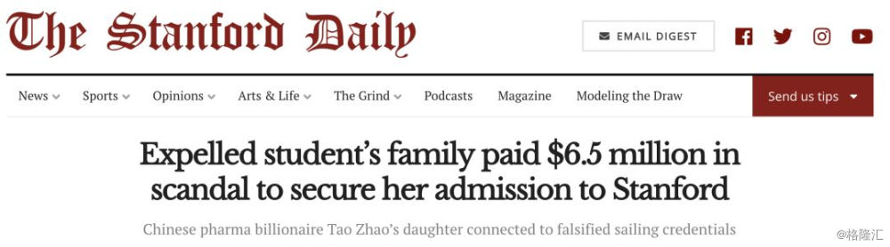 据《斯坦福日报》的最新报道,由于学校发现其涉嫌在申请材料中造假,Yusi Zhao已经被斯坦福大学开除,并于3月30日搬离校内宿舍。此外,报道还披露了Yusi Zhao的父母的情况,其家族非常富有,几十年前就已跻身国内亿万富翁行业。