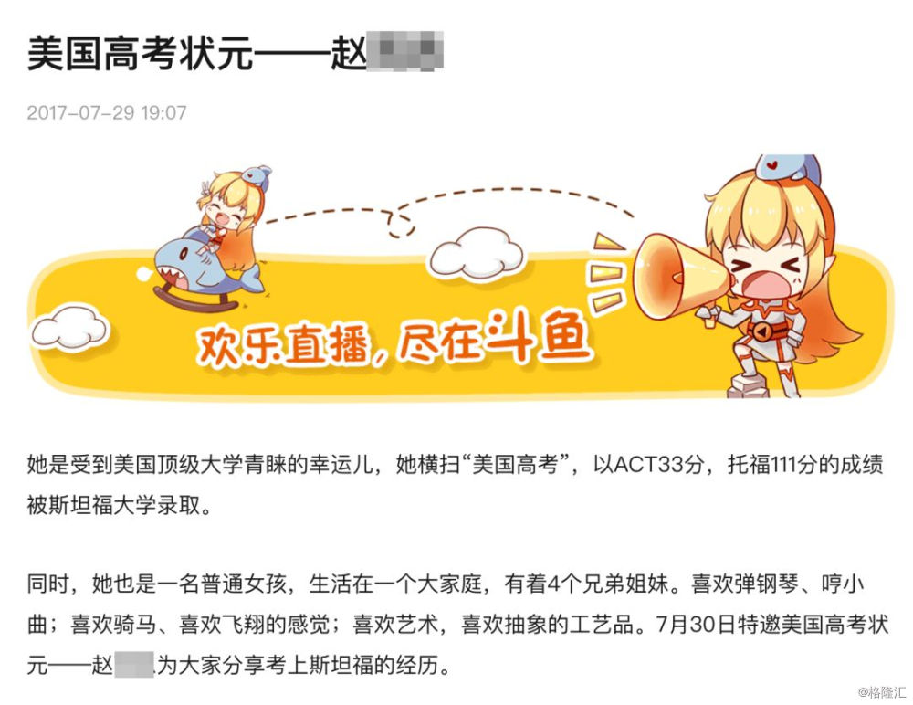 在以非法手段获得斯坦福的Offer后,Yusi Zhao曾自行在斗鱼上做了一次直播,并在宣传时自称是“美国高考状元”。