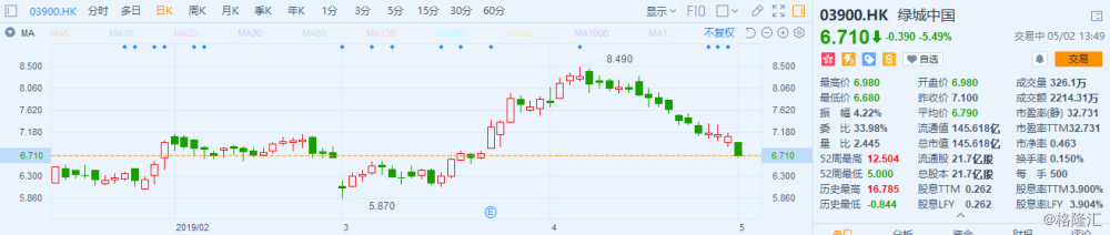 格隆汇5月2日丨绿城中国(3900.HK)大跌5.49%,报6.71港元,成交2214.31万港元,总市值145.618亿港元。