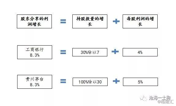 为了回答清楚这个问题,我们需要做一个分解,给定初始投资金额可以分享的利润增长等于持股数量的增长加上每股利润的增长,具体如下图,