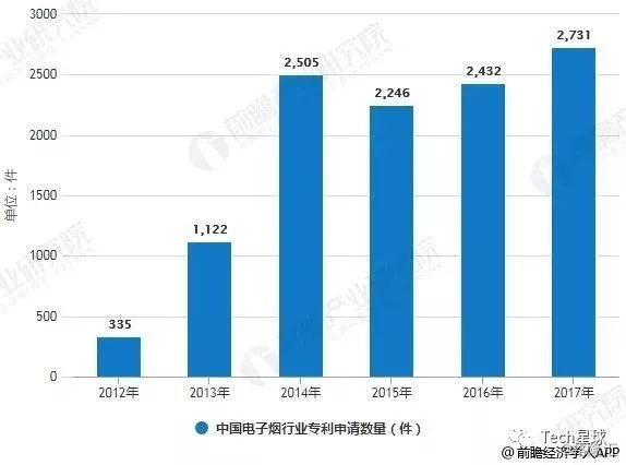 随着人们对身体健康的重视和世界范围内的禁烟潮流,作为传统烟草替代品的电子烟产业规模显著提升,增速明显。早在 2014 年,中国的电子烟产量就已经接近 6 亿支,这个数字在 2017 年增长至 16.51 亿支,翻了一倍不止。在销量和资本的双重支撑下,电子烟专利申请量也呈爆发式增长。