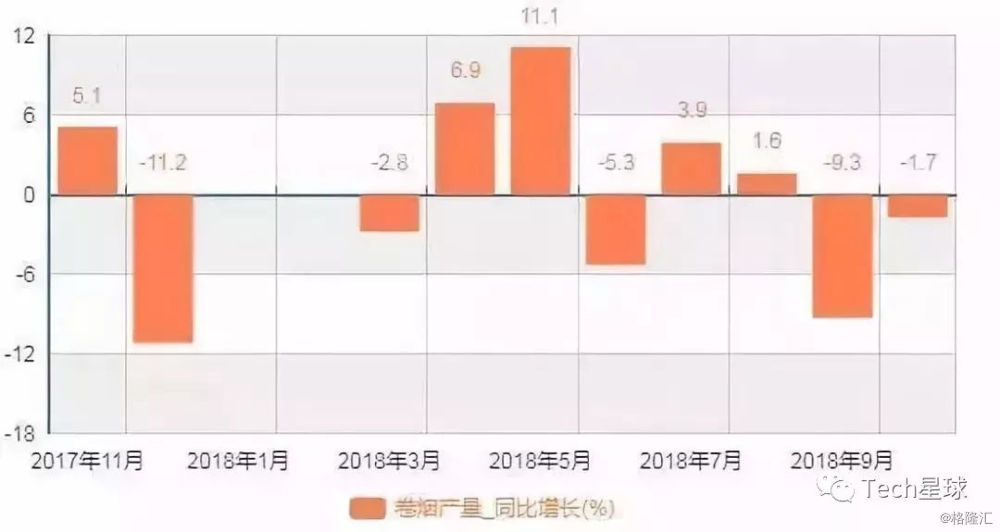 国家统计局数据显示,截至 2018 年 10 月全国卷烟产量为 1824.6 亿支,同比下降 1.7%,环比下降了 13% 左右,而 9 月的同比增速,降到 -9.3%。