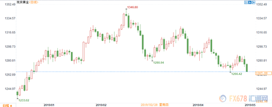 周四(5月2日)现货黄金持续走低,并跌破了1270美元关口,刷新2019年以来新低至1266.35美元,跌幅0.8%。因市场进一步看低美联储降息的预期,且中美贸易的乐观情绪也一定程度上降低了市场的避险情绪,因此使得黄金持续走低。