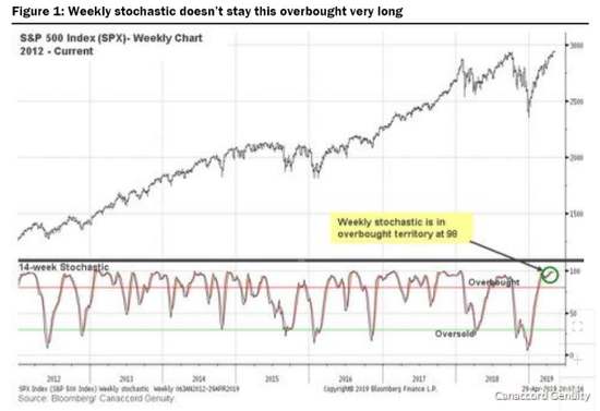 Dwyer回调的观点是基于他所描述的标普500指数已“接近极端超买/乐观水平”给出的,14周随机指标就能证明, 该指标是衡量标普过去14周,相较于其高点和低点的每周股价。此指标用于帮助识别市场转变的时间点。