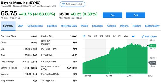 周四,人造肉创业公司Beyond Meat在纳斯达克挂牌上市,开盘价价46美元,较发行价25美元溢价84%,股票代码为BYND。截至收盘,股价上涨163%,至65.75美元。