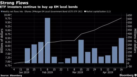 据彭博报道,新兴市场的本币债券ETF已经连续16周净流入,随着全球各大央行转鸽和中美贸易关系的缓和,上周的新兴市场债券的净流入达2月8日以来的最高水平,而于此同时,新兴市场的美元债券ETF在4月份净流出额达一年多的最高水平。