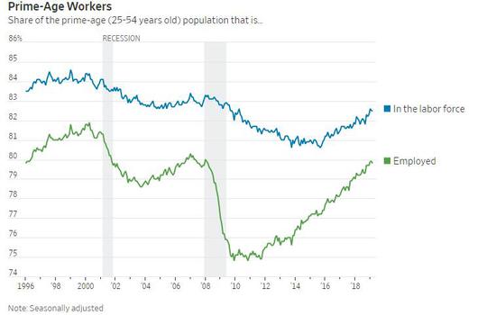 在25岁到54岁这段黄金工作年龄段被雇佣的美国人的比例在过去五年整体上升。不过该比例仍低于衰退前2007年年初的峰值80.3%,以及2000年的纪录高点81.9%。该比例在上个月略微下降。需要关注上行趋势是否在4月份重现。