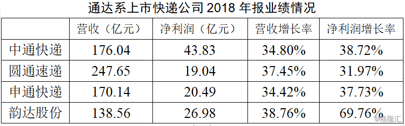 整体来看,通达系几家快递公司的营收水平有显著提高,营收和净利均实现了两位数增长。