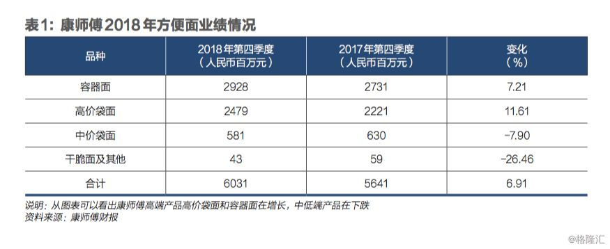 中高端产品同样帮助康师傅的方便面业务走出了衰退。2018年,康师傅的方便面业务年营收239亿元,占总营收近40%,5.7%的方便面业务增速超过公司总业务2.9%的增速。