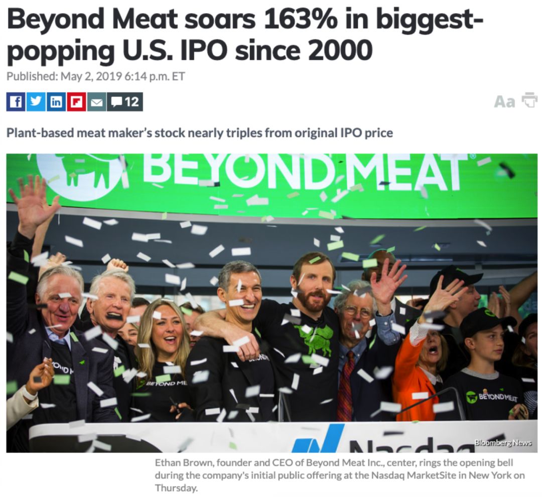 美国人造肉公司Beyond Meat上市当天的开盘价达到46美元,较发行价25美元溢价84%,盘中一度涨至72美元,最终收于65.75美元,股价上涨163%。