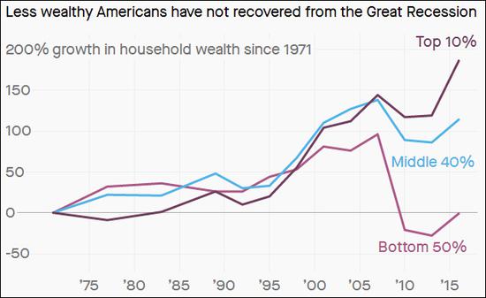 美国QUARTZ财经网站就发文称,尽管2008年金融危机摧毁了许多美国家庭,但自那时起蓬勃向上的股票市场,让美国10%最富有的人过得比以往任何时候都好。相比之下,当今收入靠后的全美半数家庭所拥有的财富,仅为2007年时期的一半,甚至低于上世纪70年代的水准。