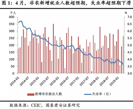 事件:美国4月非农就业人口变动 26.3万人,预期 19万人,前值 19.6万人;4月失业率 3.6%,预期 3.8%,前值 3.8%;4月平均每小时工资同比 3.2%,预期 3.3%,前值 3.2%;4月劳动力参与率 62.8%,预期 63%,前值 63%。