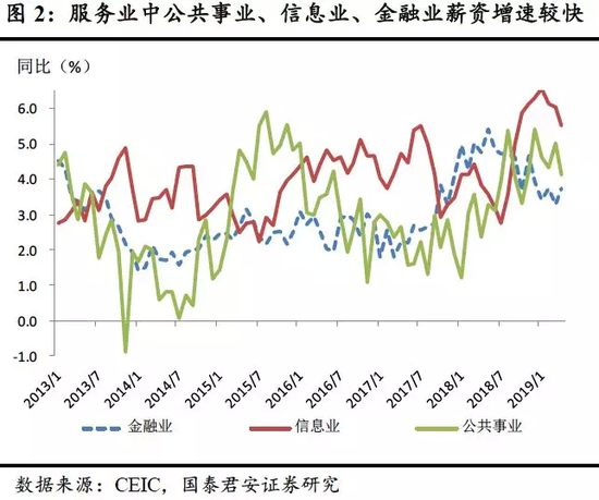 服务业中,薪资增速较高的行业主要是信息业(5.5%,前值6.1%)、公共事业(4.1%,前值5%)、金融业(3.7%,前值3.3%)、休闲和酒店业(3.7%、前值3.8%)以及专业和商业服务业(3.5%,前值3.2%)。