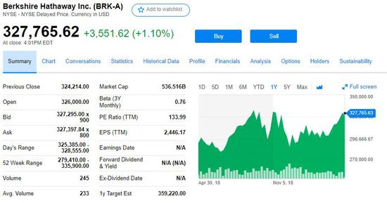 截止本周五收盘,伯克希尔A类股报收327765.62美元,B类股报收218.60美元,均收涨超1%,股价接近2018年11月以来最高。