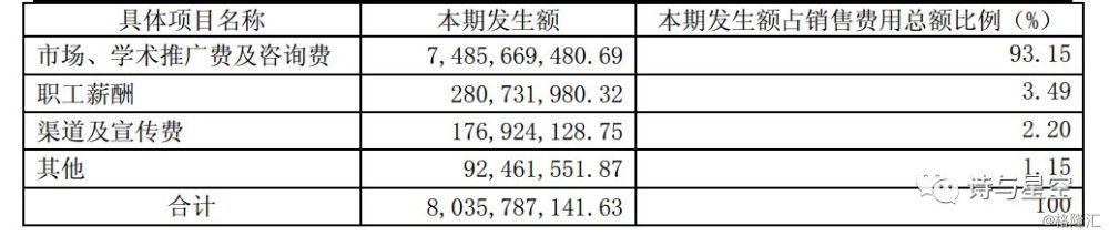 公司的销售费用超过80亿,占营收的比例为58.8%,可以说公司大部分利润都拿去做营销推广了。病人吃的药里,大半是销售推广费用。