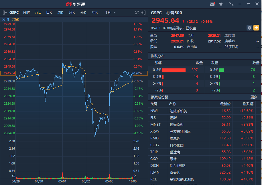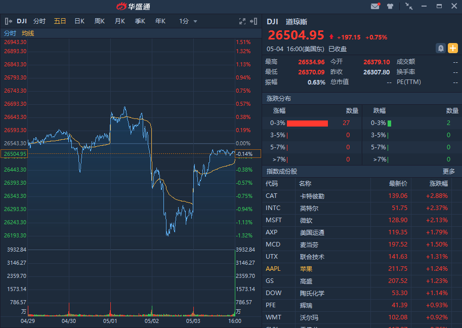 在“五一”节假日期间,道指跌0.33%,标普500跌0.01%,纳指涨0.85%。本周道指跌0.14%,标普500指数跌0.2%,纳指跌0.14%。
