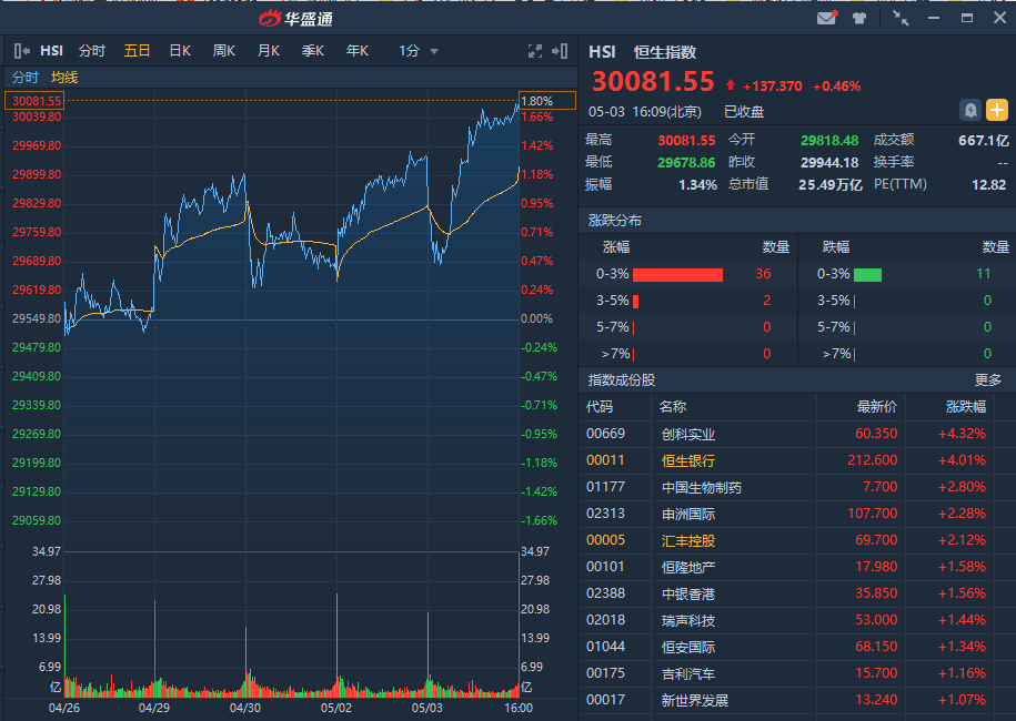 5月3日,恒生指数缩量收涨0.46%,报30081.55点,在假日期间,恒指涨1.29%,周涨1.6%,重回30000点整数关口。