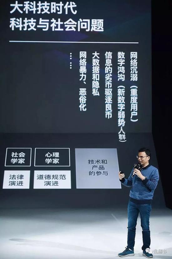 “由张志东领导的腾讯研究院前年提出了这个话题…刚刚过去的2018年是至暗时刻,滴滴的安全问题,特斯拉的安全问题,Facebook也是焦头烂额,各种隐私问题,谣言问题,伪科学的泛滥。我们在享受科技便利的同时,也在承担科技失控的风险,特别是,当科技为商业利益所左右的时候,这种风险就被更加放大了。”