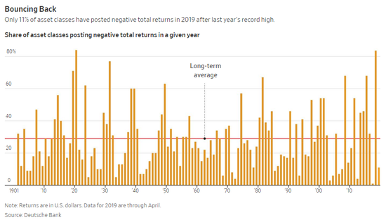 德意志银行策略师吉姆-里德(Jim Reid)和克雷格-尼科尔(Craig Nicol)说,截至今年4月,该行跟踪的70种金融资产类别中,以美元计算的总回报率接近90%。总回报包括价格变动和收到的现金(如股息或债券息票)的影响。