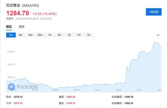 现货黄金拉升约5美元,报1284.78美元/盎司。