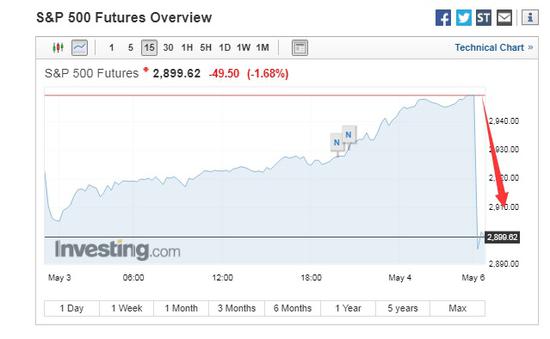 标普500指数期货重挫近1.7%,道指期货跌近500点。上周五,受非农数据大幅好于预期提振,美股大涨。