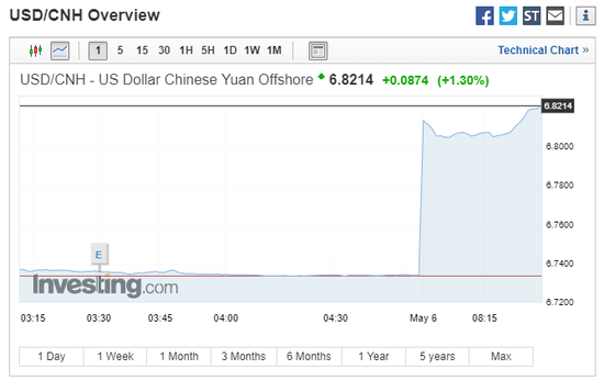 离岸人民币兑美元持续下挫,跌至6.82关口下方,报6.8201,跌幅为2016年1月以来最大;较5月4日凌晨收盘累计下跌逾850点。
