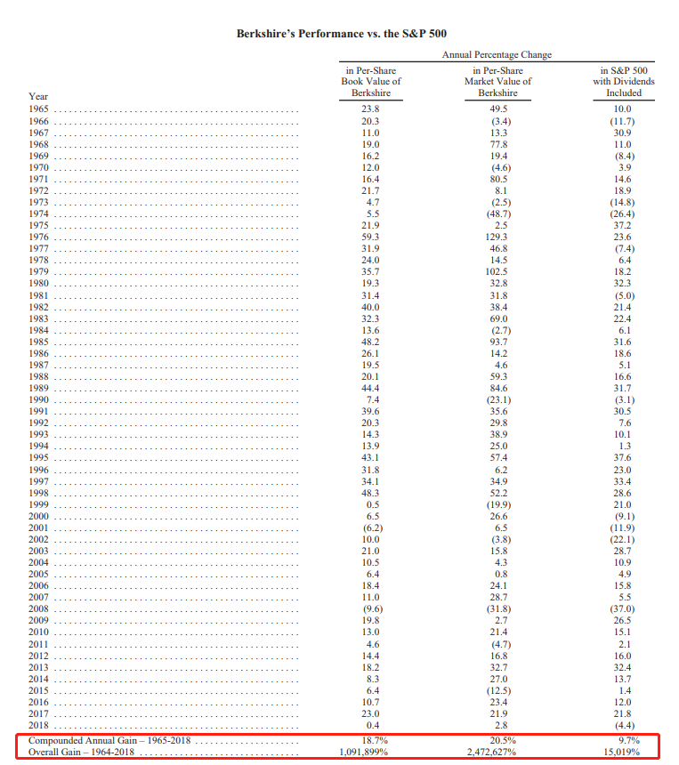 巴菲特和芒格老爷子有多厉害?如果从1964年开始投资伯克希尔1000美金,那么到了2018年底你能约拥有1253万美金之多(经过复权处理)。伯克希尔在1965-2018年的年复合增长率为18.7%,1964-2018的整体增长率超过了10918倍!这是巴老爷子常说的复利(滚雪球)的力量。