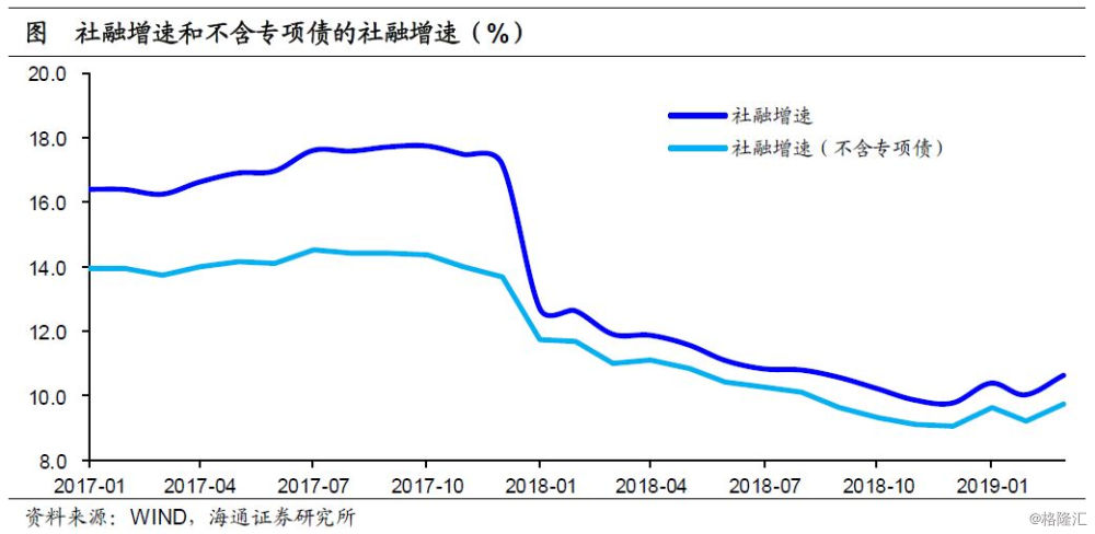 从增速来看,截至19年3月,社融余额同比增速10.7%,相比18年底回升了0.9个百分点,其中不含专项债的社融增速在9.7%左右,相比18年底回升了0.7个百分点。总的来说,地方专项债的提前发行、贷款、债券融资的放量、以及非标萎缩速度的放缓,带来社融增速在19年一季度提前见底回升。