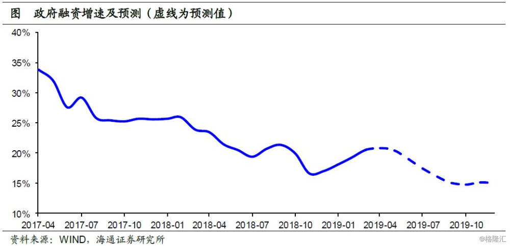 政府和居民融资均有高位回落压力。政府融资方面,根据19年的财政预算数据推算,全年政府融资增速或在15%-16%左右,19Q2之后增速逐渐回落。居民融资方面,历史上居民信贷增速同步略滞后于地产销售增速,目前商品房销售面积增速已经转负,预示着居民信贷增速也或有下行压力。
