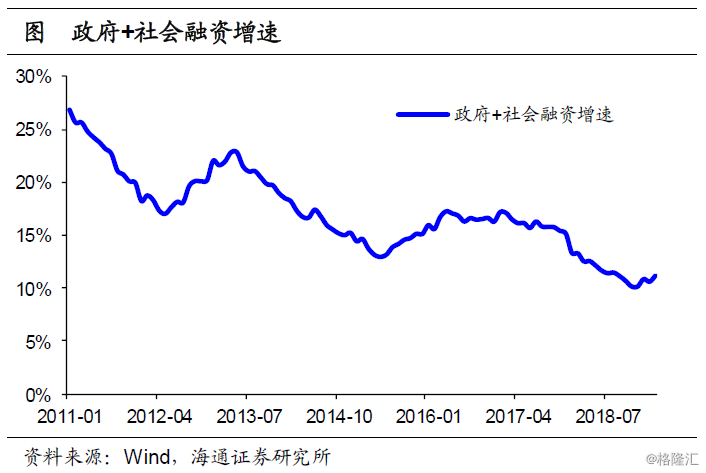 进一步的,我们可以将国债和地方债加进社融指标中,构建政府+社会融资增速的指标。从趋势来看,政府+社会融资增速19年3月为11.1%左右,高于社融增速,且相比18年底回升了1个百分点。其中19年3月政府融资增速在20%左右,相比18年底回升了3个百分点。地方专项债的放量、财政赤字率的提升,均带来了政府融资增速的回暖,也带动了社融增速的回升。