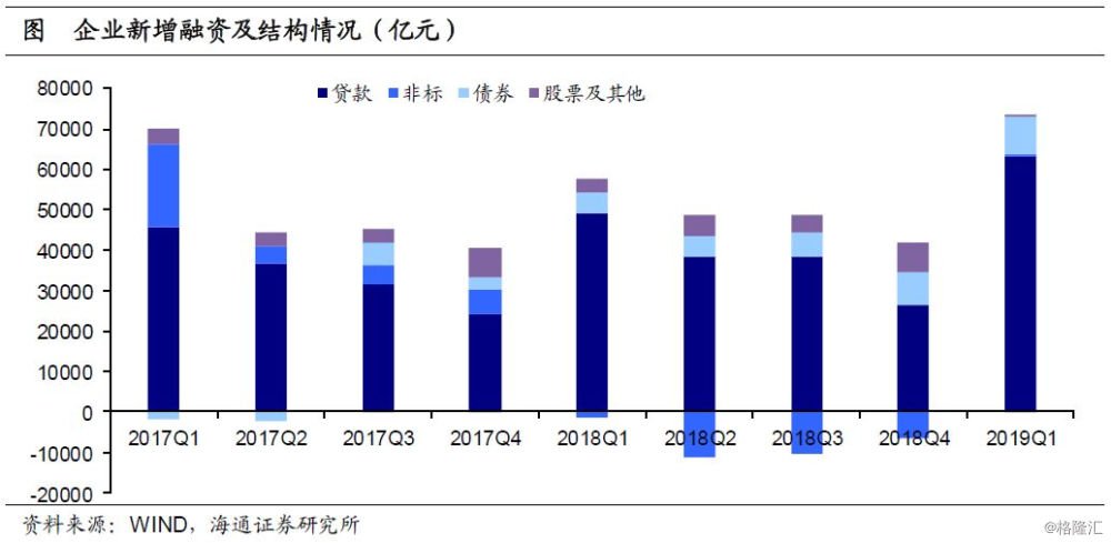 我们对社融数据进行拆分,首先将地方专项债剔除,然后拆分成居民融资和企业融资。其中居民融资主要是金融机构对居民的贷款,而企业融资则包括贷款、非标、股权融资等。经统计,19Q1居民部门新增融资1.8万亿左右,同比仅多增450亿元。而企业部门新增融资5.1万亿,同比多增1.67万亿左右。再从增速来看,居民部门的融资增速在17.6%左右,相比18年底下降了0.7个百分点;企业部门的融资增速在6.7%左右,相比18年底回升了1.1个百分点。