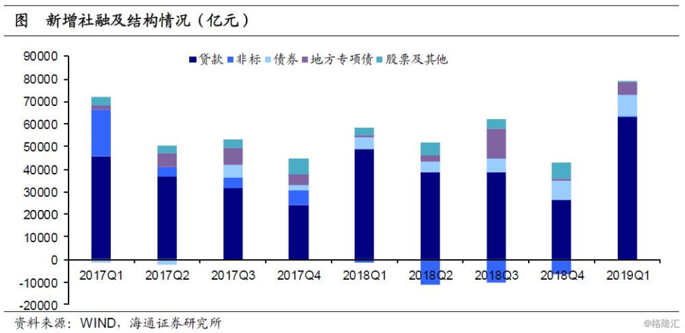 18年受到去杠杆和资管新规的影响,社融增速大幅下行。19年开年以来社融增速出现见底回升,一季度新增社融总量8.2万亿,相比18年同期大幅增加2.34万亿。分类别来看,贷款增加6.3万亿,占新增社融的77%,同比多增1.44万亿。债券新增9250亿,占社融增量的11%,同比多增3800亿。地方专项债增加5390亿,占新增社融的7%,同比多增4620亿。此外,非标增量由负转正,同比多增1940亿。
