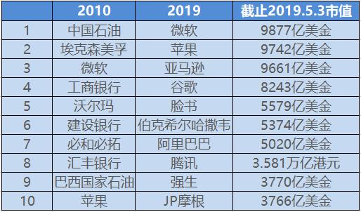 截止2019年5月3日,全球市值前十公司分别是微软(科技)、苹果(科技)、亚马逊(科技)、谷歌(科技)、脸书(科技)、伯克希尔哈撒韦(金融)、阿里巴巴(科技)、腾讯(科技)、强生(消费)、JP摩根(金融)。其中科技股占据七席,相较于2010年科技股仅占据两席。更重要的是目前前十的个股9只在美股,腾讯在港股市场,没有一只A股。