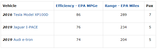 作为电动汽车的早期厂家,公司车型性能要领先传统车企多年,比如公司16年推出的Model XP100D相比 19年奥迪新产的e-tron电动车及捷豹I-PACE仍有优势。对比参数如下:美国环保署EPA所列标准下电动车能效比(MPGe)、EPA里程以及乘客容量,Model XP100D都具备优势。可能会有用户表示后两款车更便宜,但不管如何,做到同样配置传统车企的造车成本会更高,从侧面反映出公司产品的高性能及低成本。