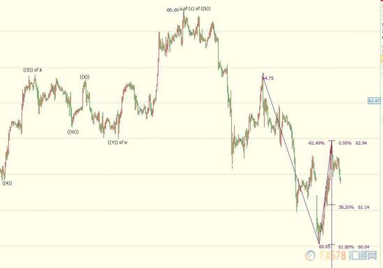 美国原油料已自62.94美元开启下行((3))浪走势,该浪是始于64.75美元的下行iii浪的子浪,iii浪又隶属于自66.60美元开启的下行五浪结构。下方目标位看向61.14美元和60.59美元,它们分别是下行((3))浪的38.2%和50%目标位。