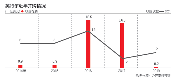 2014年到2018年五年期间,英特尔开启“买买买”模式,共进行了48笔收购,最大手笔的无疑是以167亿美元收购第二大FPGA厂商Altera和153亿美元收购自动驾驶公司Mobileye。
