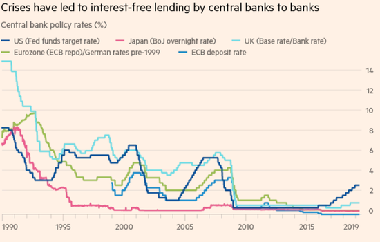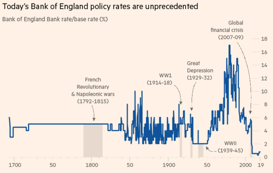 令人惊讶的是,在2009年之前,英国央行从未以低于2%的短期利率向银行放贷。这一利率水平低到足以应对拿破仑战争(Napoleonic wars)、两次世界大战和大萧条(Depression)。然而,在过去10年里,它的利率一直接近于零。