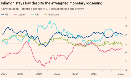 美联储已设法将联邦基金利率提高至2.5%,但难度很大。欧洲央行和日本央行的利率仍接近于零。自1995年以来,后者的利率一直接近于零。然而,日本央行仍未能使通胀率远高于零。疲软的通货膨胀并不仅仅是日本的问题,其他地区的通胀率也依然非常低。