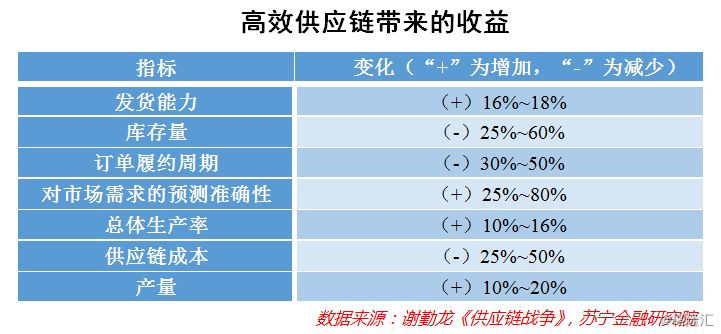 Costco的实践表明,零售商品真的是可以兼顾“物美”与“价廉”的,而背后的关键便在于供应链能力。有研究表明,如果实施完整有效的供应链战略,那么可以收获的效益将不是一点半点(参见下表)。与此同时,高效供应链还有助于对市场变化快速响应,提高上下游企业的整体合作效率。而这些都是提升企业竞争力的关键。