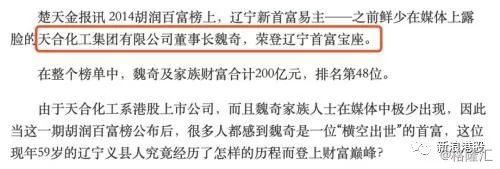 2014年6月20日,天合化工在香港上市,募集资金约50亿港元,上市之初市值一度飙升至约650亿港元。天合化工集团创始人魏奇也因此跃升为辽宁首富。