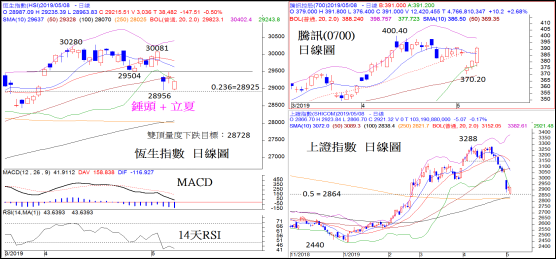 受到道指今晨下挫400多點的影響,恆生指數今早裂口低開300多點之後最低跌至28963,差7點才跌穿5月6日低位28956。其後受到騰訊(0700)顯著上升及A股回穩所帶動,恆指跌幅收窄至少於200點,重上29200的水平。