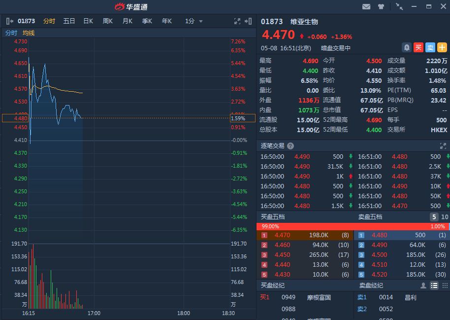 维亚生物暗盘暂报4.47港元,较发行价4.41港元涨1.36%,暂成交突破1亿港元,最新总市值67.05亿港元。