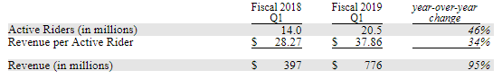 季度收入及活跃乘客增长均超分析师预期,收入同比增长95%至7.76亿美元,优于华尔街预计的7.385亿美元。活跃乘客同比增长46%至2050万,环比增长10%,而每位活跃乘客的收入增长34%至37.86美元,管理层称目前处于交通共享服务长期转变的早期阶段,未来规模及收入将持续扩大。