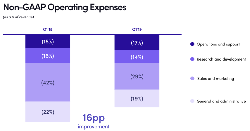 调整后亏损超预期背后是运营开支的良好控制,一季度平台贡献利润率(除去各类成本但包括研发支出的营收/总营收)达到50%,远高于去年同期的35%。Non-GAAP营销费用占营收比例从42%下降到29%,四项开支中只有运营及支持成本占比有2个点的升高,其余均有改善。