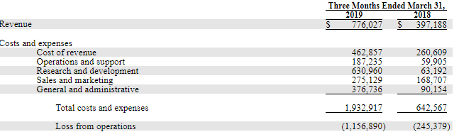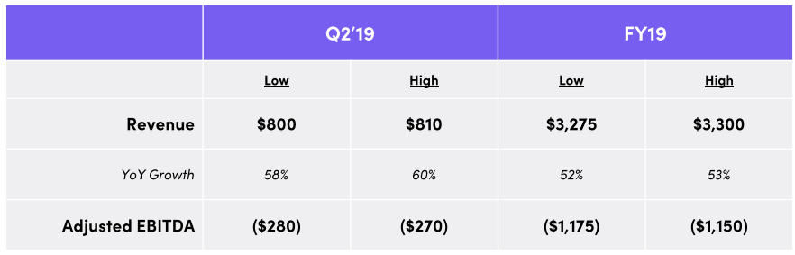 公司连续6年亏损,一季度也不例外,公司总计亏损11.4亿美元,超过2018年全年的亏损额,多数成本来自于与IPO相关的股票激励支出(8.595亿美元)。调整后亏损2.115亿美元,低于去年同期的2.284亿美元,同时优于分析师此前预计的调整后亏损2.74亿美元。调整后每股亏损9.02美元,远超分析师预计的3.97美元。